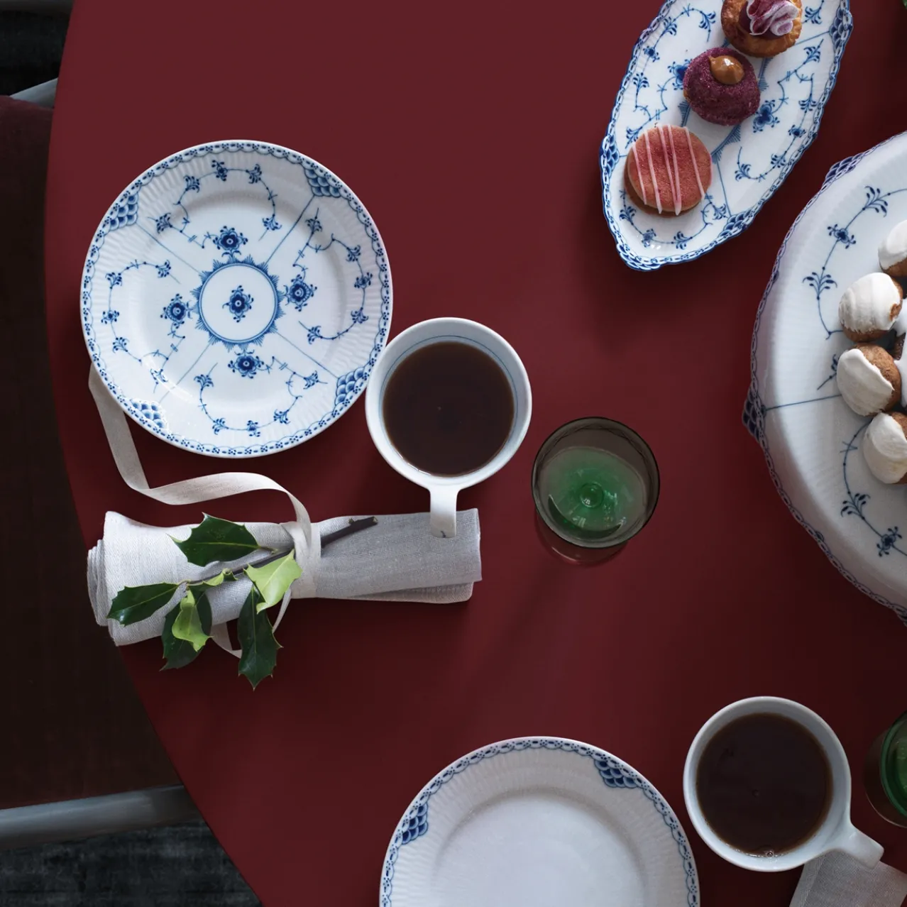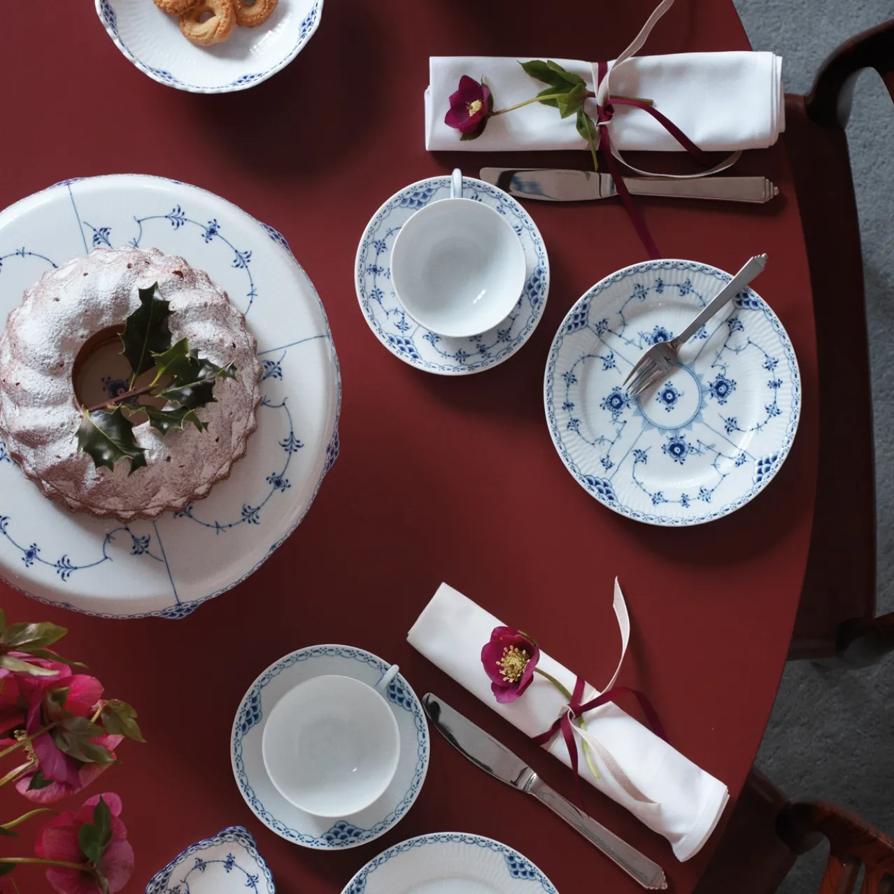 Though they are all decorated with the classic pattern of the collection, the four plates in Blue Fluted Half Lace each have their own expression due to their different sizes. The small, 19 cm plate is a delicate and elegant piece to use as a dessert plate or lunch plate. Blue Fluted Half Lace is adorned with delicate lace, elegantly framing the hand-painted motif and charming details of the collection such as snail shells on lids and handles. The collection is a beautiful and classic example of the Royal Copenhagen craftsmanship – it takes 1,197 brush strokes – no more, no less – to paint a Blue Fluted Half Lace dinner plate.