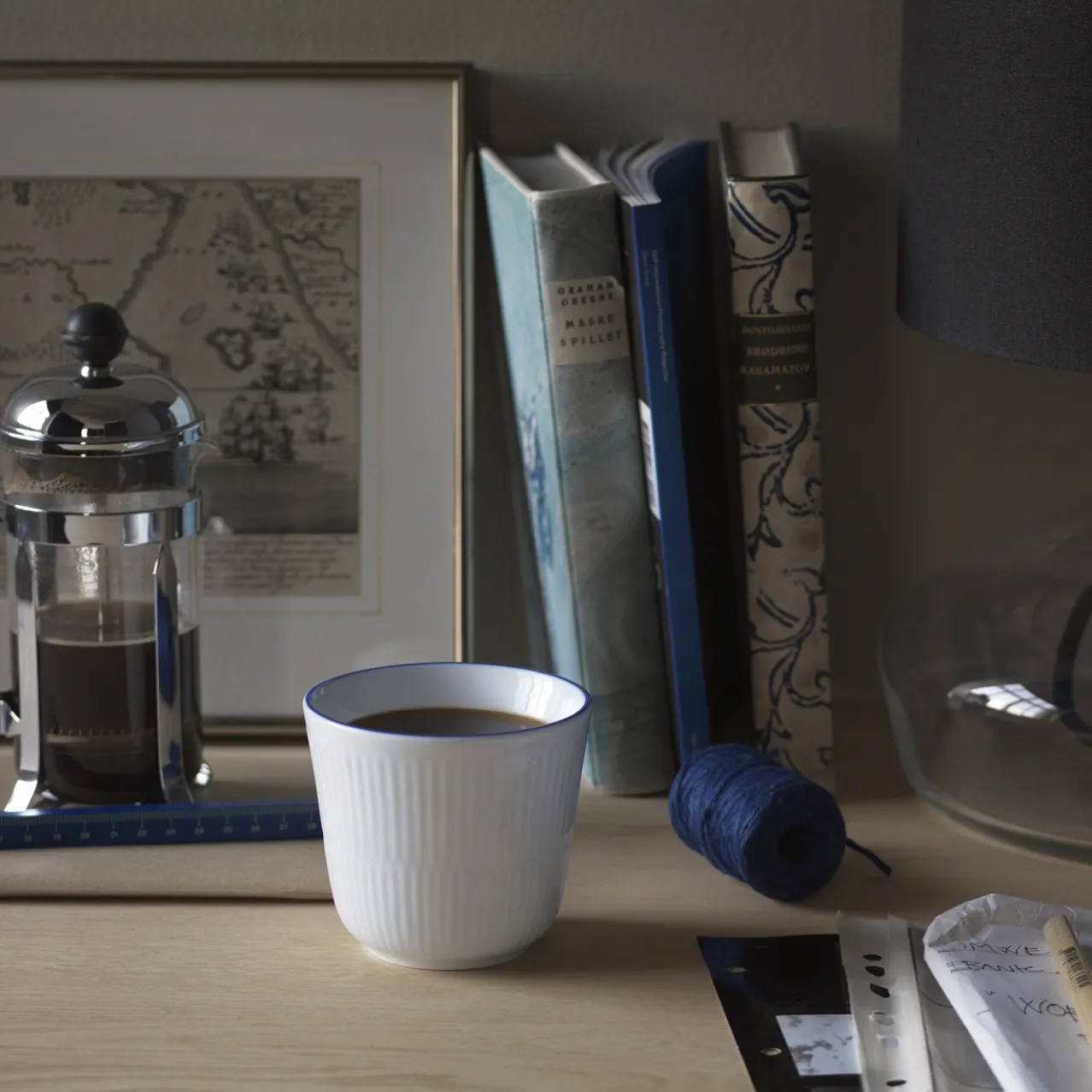 The Blueline thermal mug is the epitome of the union of function, beauty and simplicity. No handle, no frills. Just pure lines and minimalistic beauty. Like a subtle signature, the collection’s logo stamp is found at the bottom of the mug –only visible from above, only visible after the last sip. From the side, the white flutes and the thin blue line painted with incredible precision are left to shine in cool elegance. Quite simple, quite remarkable.