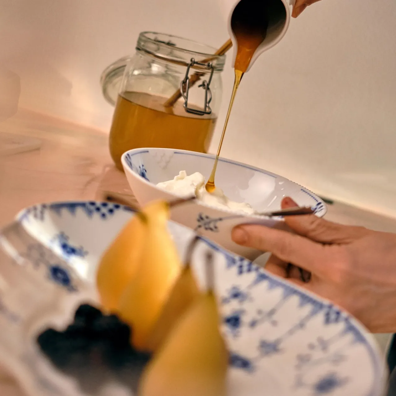 The small 78 cl Blue Elements Bowl lets loose in a playful combination of classic elements from Royal Copenhagen’s collections. The tactile flutes and iconic, jagged edge from Flora Danica are adorned by twirling flowers and palmettos, hand painted with an informal expression. The bowl makes for a playful table setting, and it is ideal for use as a cereal bowl or for servings of snacks and sides. The Blue Elements collection blooms in elegant joyfulness with an inspiring combination of classic Royal Copenhagen design elements and classic, hand painted decorations that grow freely across porcelain surfaces. Like White Elements and Multicoloured Elements, the collection shines on its own or in a combination with classic collections from Royal Copenhagen in a playful style of contemporary beauty.