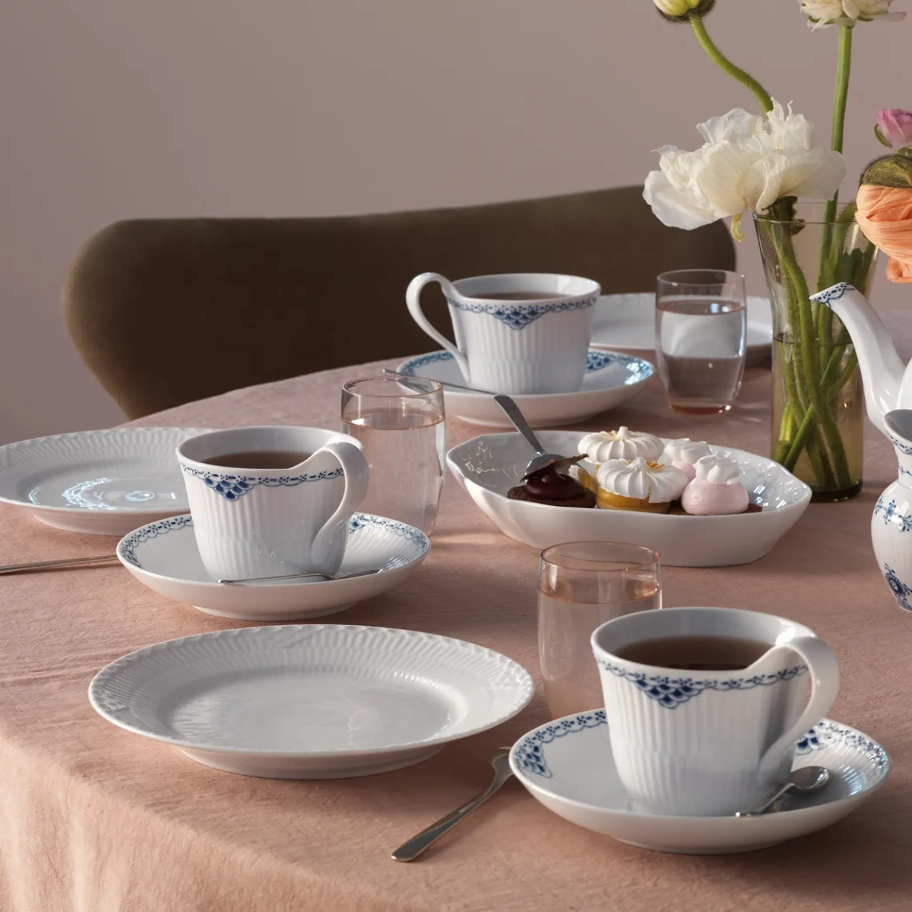 This Princess Teapot contains up to 100 cl, making it ideal for tea for two. The angled spout is hand painted with a refined lace, which is also present on top of the porcelain pot, while the lid and handle are decorated with blue painted snail shells. The delicate Princess collection epitomises classic femininity. Every piece in the collection is encircled by a fine, hand painted lace border and decorated with fish scale decorations and handmade flutes. The elegance of the collection adds a touch of old-worldly beauty to any scene.