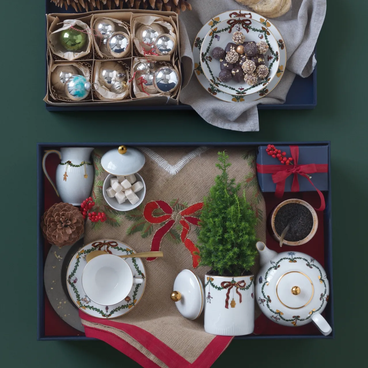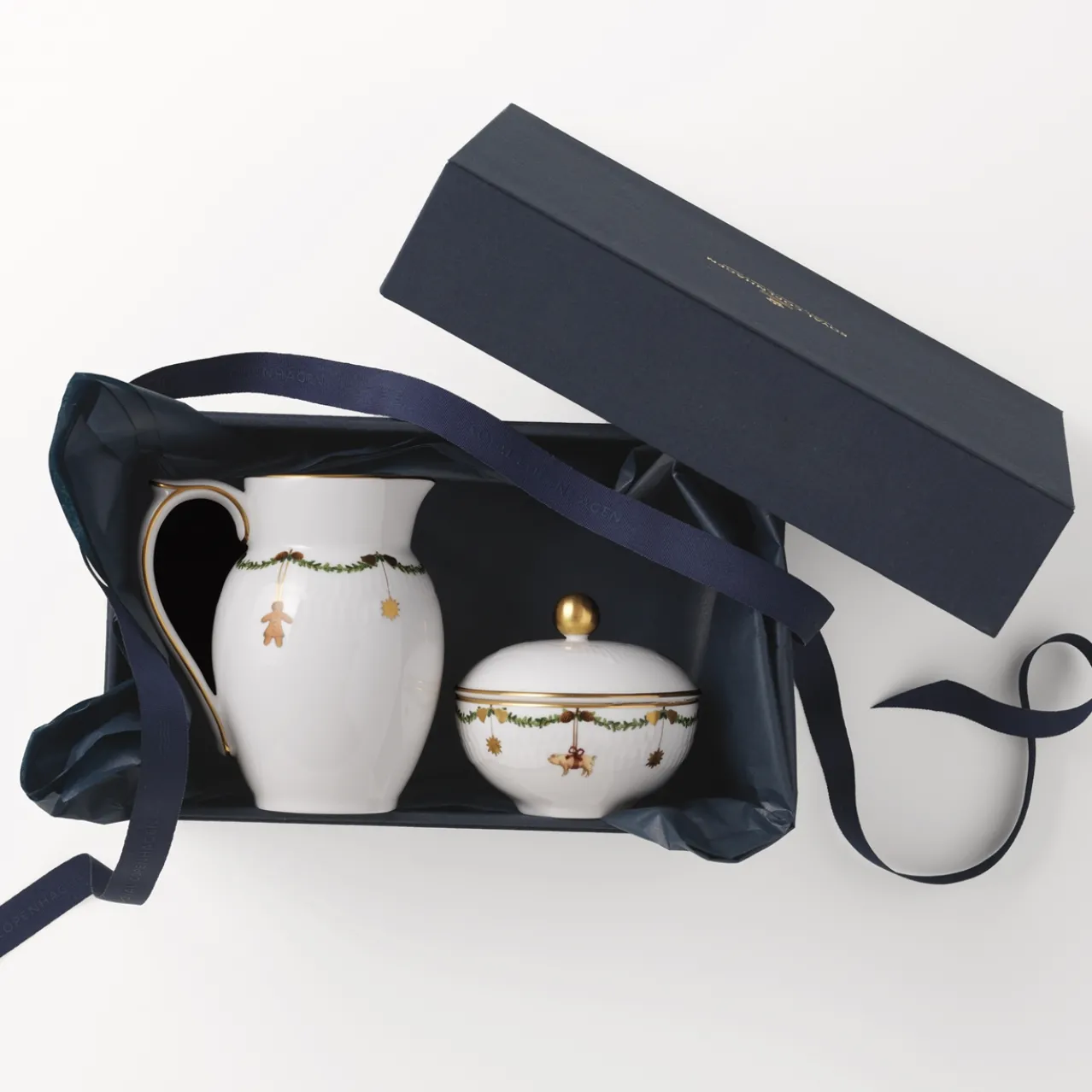 Adorned with gold details, a wreath of spruce and Christmas ornaments, this Star Fluted Christmas jug is an elegant addition to any table. The 39 cl jug is ideal for both cold and hot beverages, and it also functions as a cream jug or milk jug. Nothing encapsulates the spirit of the holidays quite like gathering around the table for cozy moments of joy and togetherness. This is where the beloved Christmas dinner service from Royal Copenhagen has come to life and become a part of many holiday traditions. The festive wreaths of spruce bordering the plates, bowls and cups are adorned with silk ribbon bows and Christmas decorations, creating a rich and elegant service, which is the perfect background for all your joyful holiday meals.